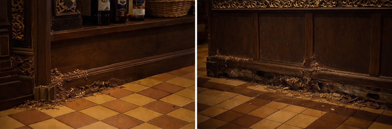 Restaurant staff noticed small mud trails and wood that sounded hollow when tapped in three areas: near the storage pantry, under the front dining area bar counter, and at the back office wall panel. Mud tubes are classic indicators of termite activity, showing that termites were actively foraging and feeding within the building. Regular termite inspections are key in tropical cities like Kuala Lumpur, where warm and humid conditions are ideal for termites.